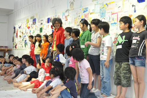 震災直後に起こったこと、1年後のいま考えていること、そして未来への想い…。荒井良二さんは、集まった人々のメッセージをつなげて、あの悲惨な震災から未来へと進んでいく復興の時を、10メートルのキャンバスに表現しました。巨大な震災絵巻の制作には、山形の子どもたちも参加しました。よく眼を凝らすと、子どもたちの絵の隙間をぬうように、荒井良二さんが描いたたくさんの「小さな子どもたち」が、未来へと向かって駈けています。恐怖、喪失、愛情、希望、奮起、たくさんの声やイメージが響きあう、まるでオペラを観ているような、素晴らしい東北未来絵巻が完成しました。